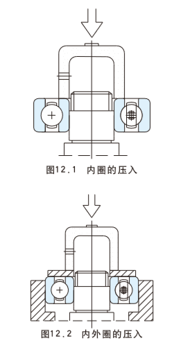 非分離型軸承(如深溝球軸承),內、外圈都需要過盈安裝的場合應如圖12.2所示。內、外圈端面同時墊上墊塊后,將內、外圈同時壓入。調心球軸承外圈容易傾斜,即使不是過盈配合,也應墊上墊塊安裝。